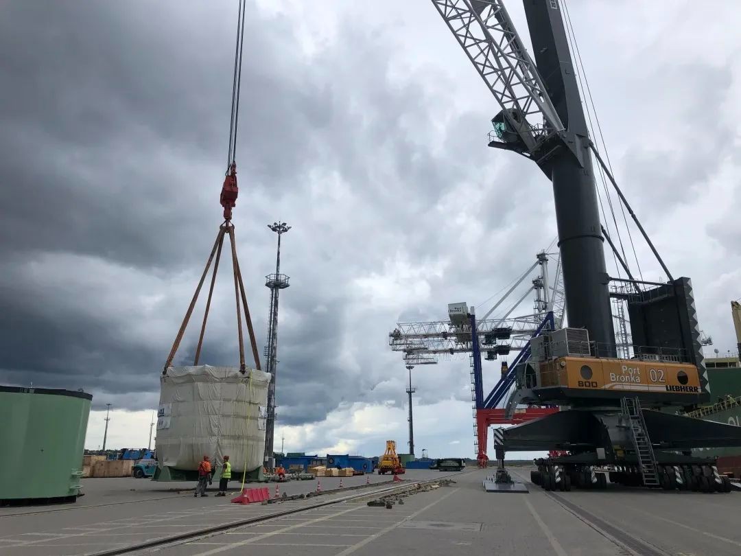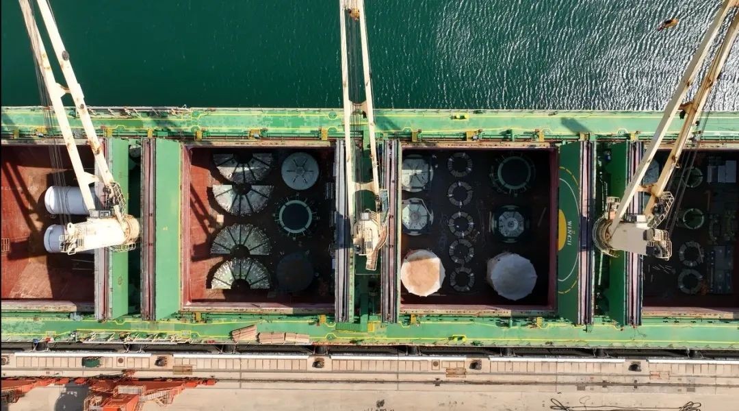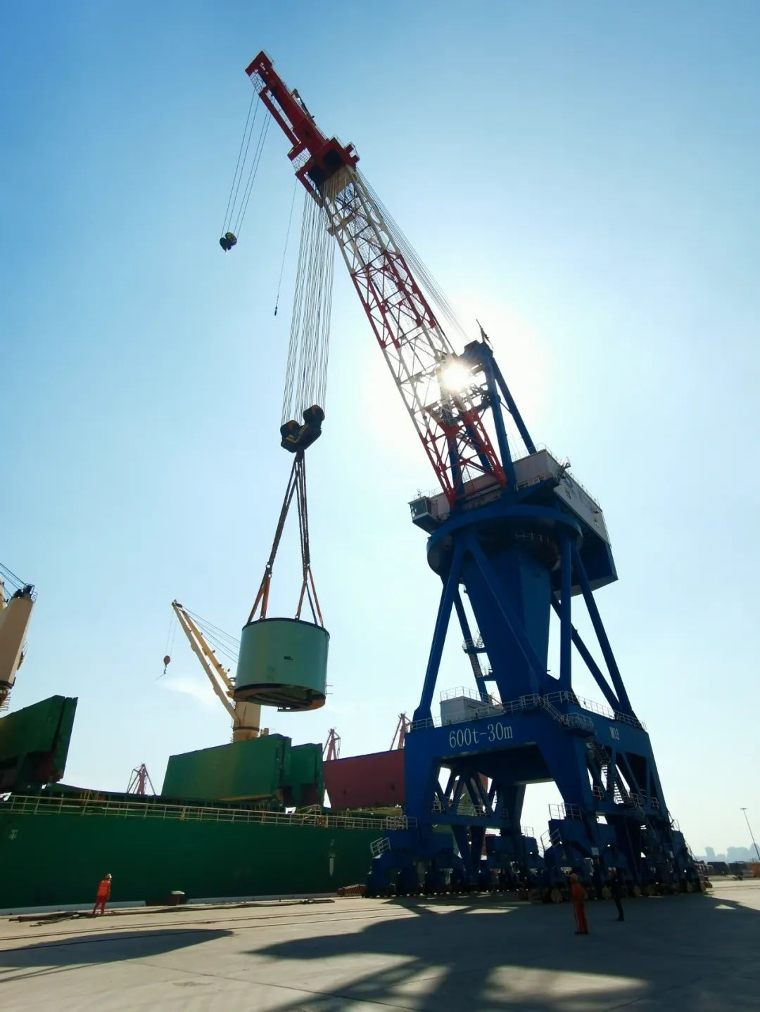 ▲裝貨港裝船9月21日,經(jīng)過12000海里的航行,滿載四臺(tái)VVER機(jī)組大件設(shè)備的貨輪順利抵達(dá)國內(nèi)卸貨港營口港錨地,9月24日停靠營口鲅魚圈港,經(jīng)過兩個(gè)晝夜的不停作業(yè),26日完成所有設(shè)備卸船工作,9月28日至29日完成駁船裝船和汽車裝車工作,通過水路和公路分別運(yùn)往田灣現(xiàn)場(chǎng)。