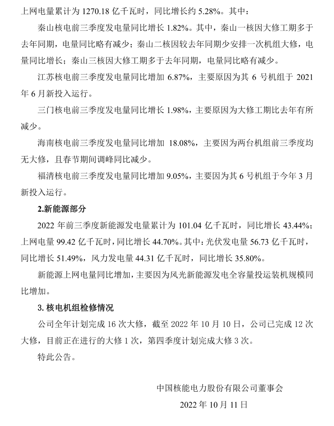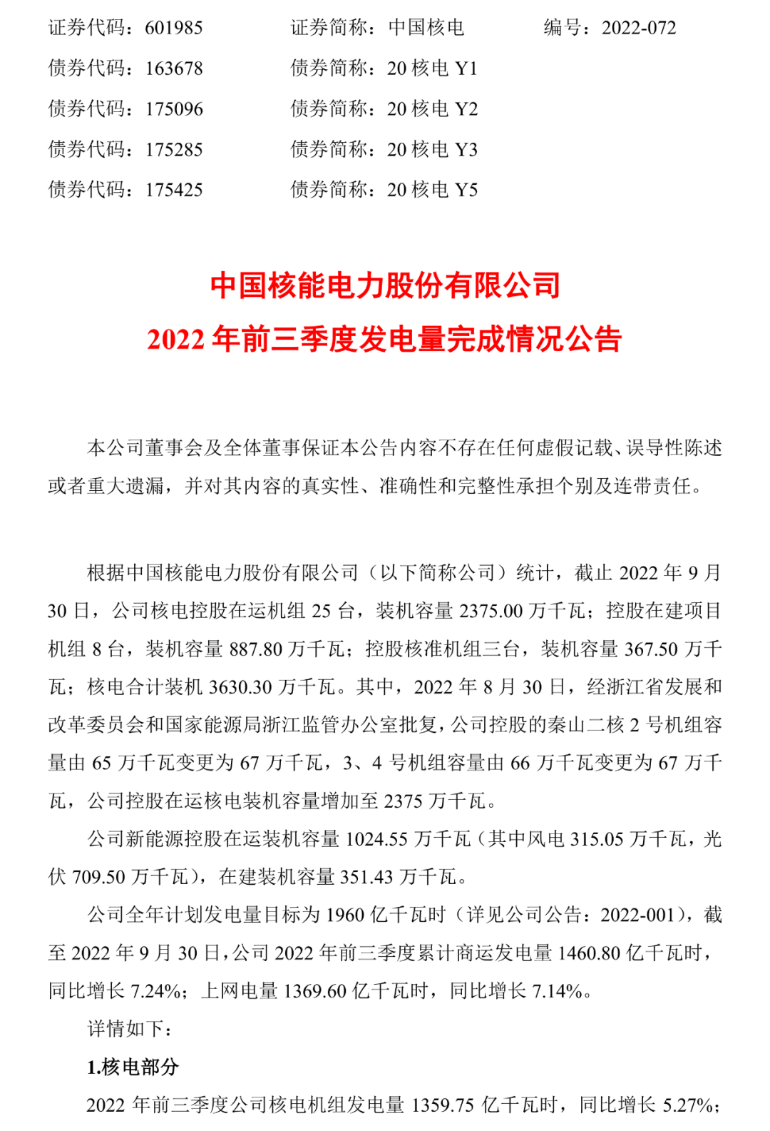 根據中國核能電力股份有限公司(以下簡稱公司)統計,截止 2022 年 9 月30 日,公司核電控股在運機組 25 臺,裝機容量 2375.00 萬千瓦;控股在建項目機組 8 臺,裝機容量 887.80 萬千瓦;控股核準機組三臺,裝機容量 367.50 萬千瓦;核電合計裝機 3630.30 萬千瓦。其中,2022 年 8 月 30 日,經浙江省發展和改革委員會和國家能源局浙江監管辦公室批復,公司控股的秦山二核 2 號機組容量由 65 萬千瓦變更為 67 萬千瓦,3、4 號機組容量由 66 萬千瓦變更為 67 萬千瓦,公司控股在運核電裝機容量增加至 2375 萬千瓦。