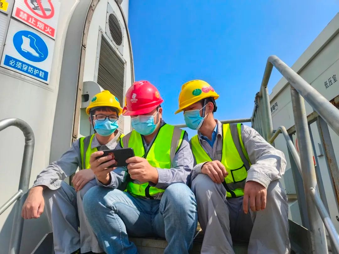 湖北分公司風電分公司黃梅太白湖風電場員工羅宇翔、周小勇、黃翼輝收看黨的二十大開幕會。