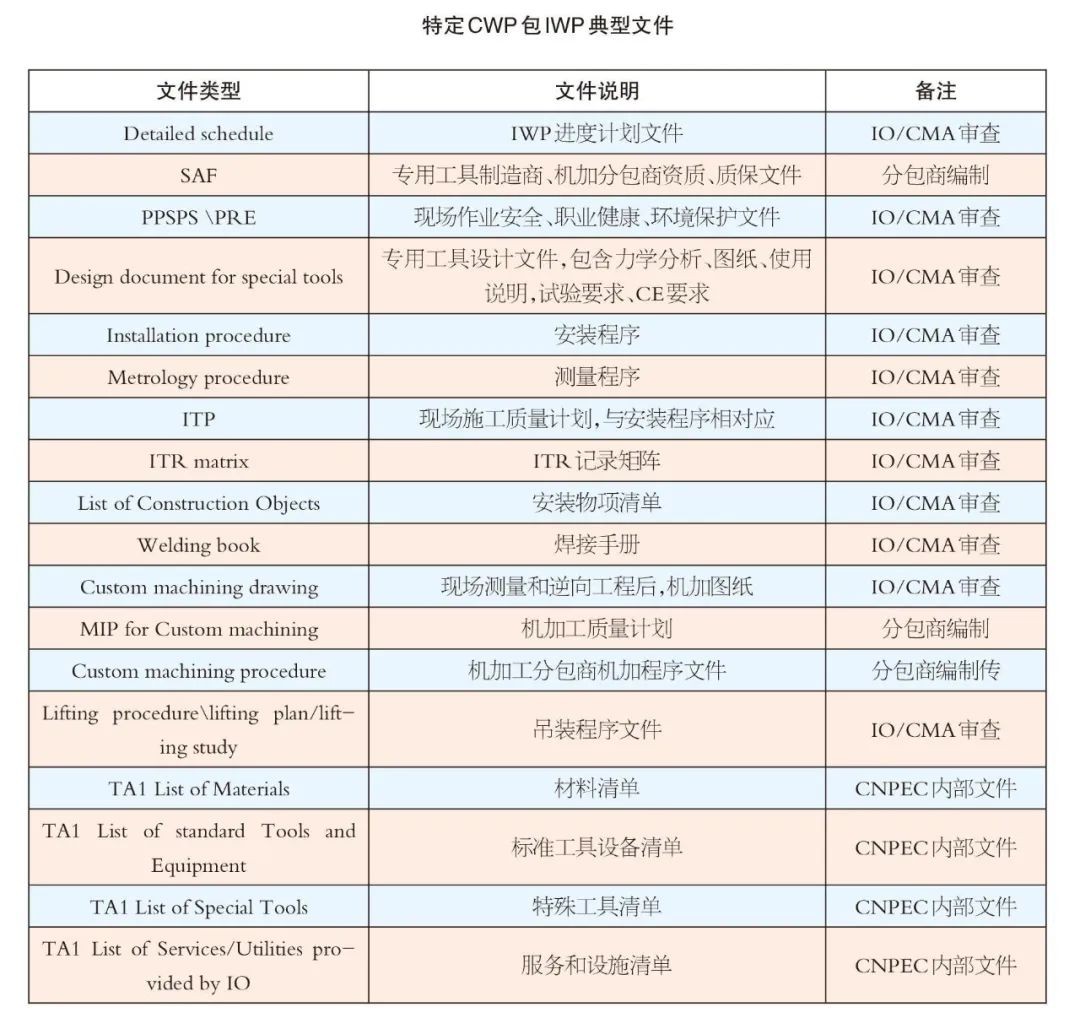 特定CWP包IWP典型文件是每個CWP包都需要的內容,直接指導現場施工活動的程序,包括專用工具加工制造圖紙、計算報告,安裝程序;測量程序,吊裝程序(計劃),機加圖紙,現場服務商分包作業程序等。