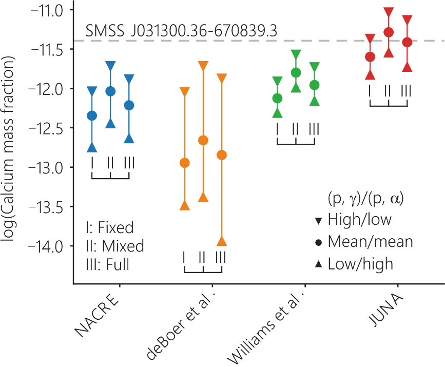 與此同時,該團隊與天體物理學家合作研究了該反應率在第一代星中的影響,計算表明19F(p,γ)20Ne反應突破出去的概率比之前預想的要大7倍左右,導致生成例如鈣類重物質的概率,比之前預計的要大很多,從而解釋了最古老恒星中觀測到的鈣豐度問題。值得一提的是,在近期發射升空的JWST的關鍵科學目標之一,即是對宇宙中最古老的第一代星和星系的探測,目前已經觀測到一批古老的恒星群。因此,本工作為研究JWST未來的觀測結果提供了可靠的核物理輸入量。