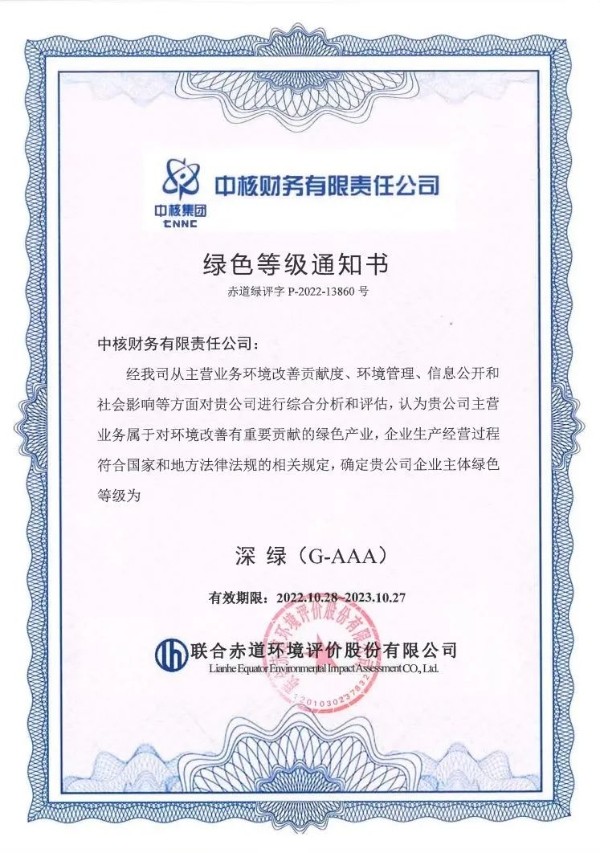 近日,經聯合赤道環境評價股份有限公司評估,認定中核財務公司屬于對環境改善有重要貢獻的綠色企業,確定公司獲得綠色企業最高等級“深綠G-AAA”主體認證。聯合赤道環境評價股份有限公司是國內權威的綠色金融評估認證機構,也是國內最大的信用信息服務機構之一。