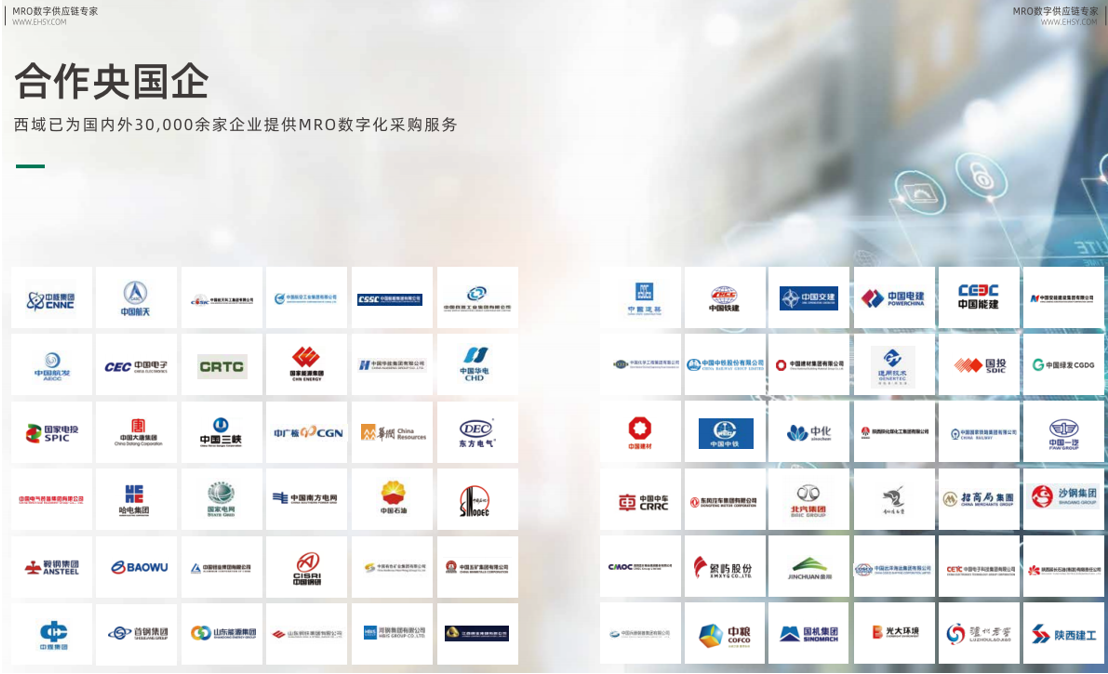 西域由IDG資本、ADV資本、奇誠投資等頂級投資機構注資,已為80%制造型央國企以及60%全球500強企業在內的30,000余家國內外企業提供專業化、高標準的MRO數字化采購服務,其中包括中國五大發電央企集團、十大軍工央企集團、八大建筑央企集團等國有企業,西門子、ABB、贏創、帝斯曼、蘋果等外資企業以及大疆、飛鶴等民營企業。
