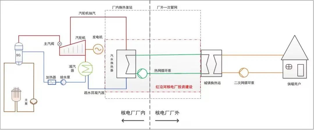 核能供暖是指以核能產生的無放射性蒸汽為熱源,通過換熱站進行多級換熱,最后經市政供熱管網將熱量傳遞至最終用戶的城市(群)集中供暖方案。