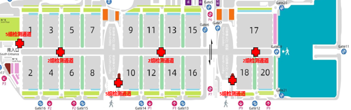 展館內(nèi)核酸檢測點位置如下圖所示,為了保障次日更便捷進館,建議每天展會結(jié)束前至核酸檢測點及時進行核酸檢測。