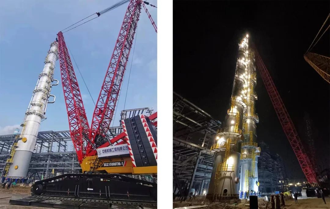 2022年11月16日中核機械工程圓滿完成大連恒力石化項目苯二塔設備吊裝,歷時2小時6分鐘。自11月11日起,中核機械工程使用1000噸履帶式起重機作為主起重機,650噸履帶式起重機配合溜尾,高效完成兩臺大件設備吊裝,現場安全可控。兩臺大件設備苯一塔、苯二塔吊裝總重量約686噸。