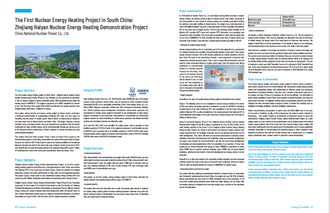據(jù)悉,我國(guó)南方地區(qū)首個(gè)核能供熱項(xiàng)目——浙江海鹽核能供熱示范工程(一期)于2021年12月3日在浙江海鹽正式投運(yùn),供暖面積達(dá)46萬(wàn)平方米,惠及近4000戶居民。該項(xiàng)目由中國(guó)核電旗下秦山核電牽頭實(shí)施,計(jì)劃于“十四五”末全部建成,可滿足海鹽縣約400萬(wàn)平方米供暖需求。相對(duì)于南方地區(qū)的電取暖方式,該項(xiàng)目全部建成投運(yùn)后,年供熱量將達(dá)到70.4萬(wàn)吉焦;相對(duì)于燃煤火電機(jī)組,每年可減少燃用標(biāo)煤約2.4萬(wàn)噸。相應(yīng)地每年減排二氧化硫204噸、氮氧化物177.6噸、二氧化碳6.3萬(wàn)噸。