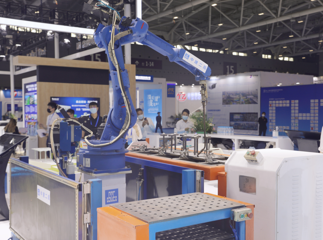 智能建造推動核電“智”造。現場展出的“埋件焊接機器人”由中建二局研發,主要針對核電項目核島施工中標準預埋件數量居多、焊接工作量巨大這一施工難題,該設備整體由焊接機器人和固定工作臺兩部分組成,能夠實現自動定位、智能焊接。相比人工焊接,該設備的應用效率提升了三倍,大大降低了對焊工的需求。