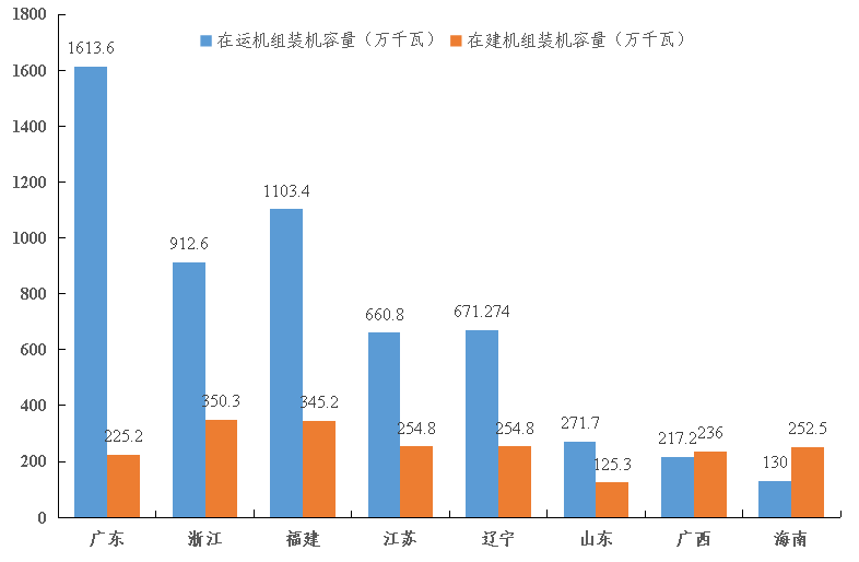 圖1 我國大陸各省份在運在建核電機組情況(截至2022年12月31日)