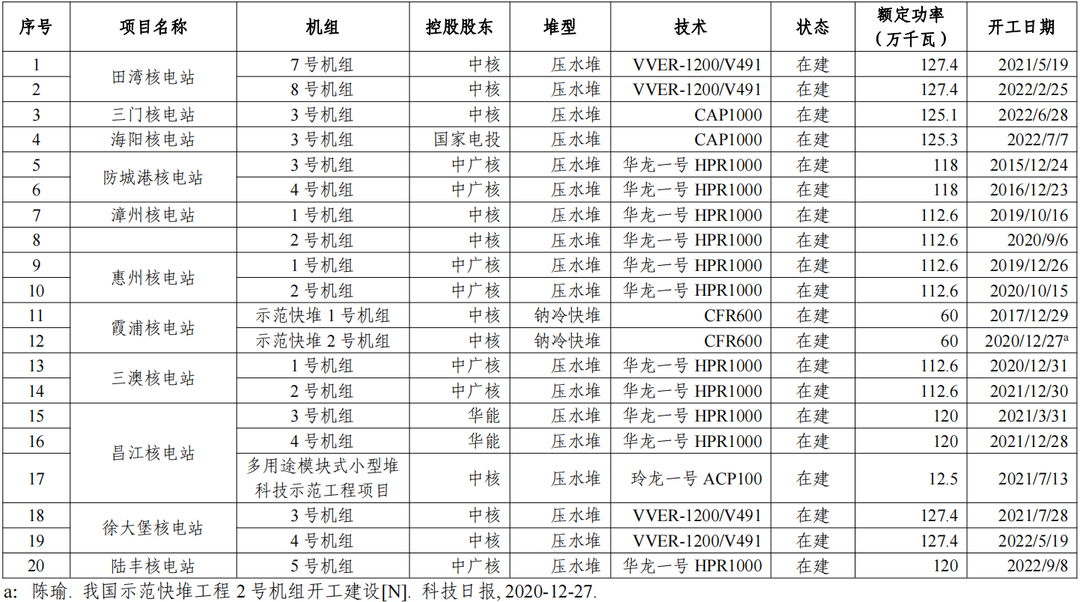 表2 我國大陸在建核電機組情況(截至2022年12月31日)