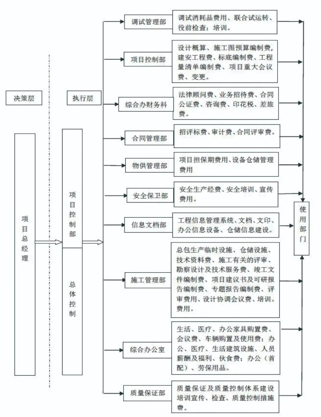 項(xiàng)目部成本控制體系,主要分為決策層與執(zhí)行層兩個(gè)層次。其中執(zhí)行層又分為三級(jí):一級(jí)控制為項(xiàng)目控制部;二級(jí)控制為歸口管理部門;三級(jí)控制為使用部門。所有成本項(xiàng)目明確相應(yīng)的管理部門及其職責(zé),各責(zé)任部門在職責(zé)范圍內(nèi)負(fù)責(zé)內(nèi)控預(yù)算項(xiàng)目的修訂變更、實(shí)際執(zhí)行和考核結(jié)果。