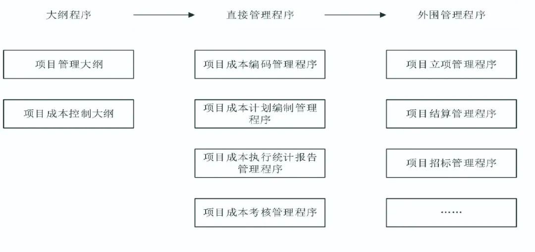 項(xiàng)目成本控制主要程序包括大綱性程序、管理和工作程序,其中管理程序包含了成本控制相關(guān)的直接管理程序和外圍管理程序(成本控制有關(guān)程序)。成本控制相關(guān)程序全面覆蓋項(xiàng)目部所有成本控制管理工作。