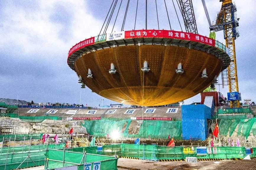 2021年10月24日,模塊化多用途小堆“玲瓏一號”鋼制安全殼底封頭提前吊裝完成。