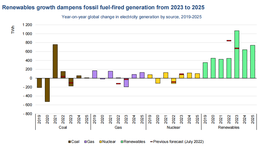 國際能源署對2023—2025年全球電力市場發(fā)展情況做出預(yù)測??稍偕茉春秃四軐⒃跐M足全球電力需求增長方面占主導(dǎo)地位,滿足90%以上的增量電力需求。全球天然氣發(fā)電量和燃煤發(fā)電量將大致保持平穩(wěn)。可再生能源在全球電力結(jié)構(gòu)中的占比將從2022年29%上升到2025年35%。因此,全球與發(fā)電相關(guān)的碳排放量在2023—2025年間將趨于平穩(wěn),并在未來逐步下降。