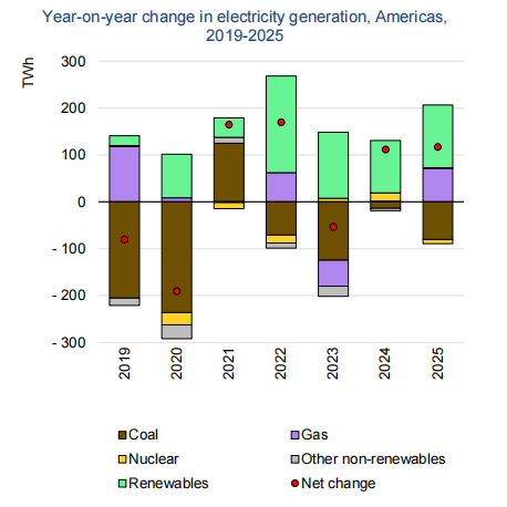 美洲地區(qū)電力需求已連續(xù)兩年增長,2021年同比增長4%,2022年同比增長2.3%。在該地區(qū)2022年總發(fā)電量中,可再生能源、天然氣、煤炭、核能和石油發(fā)電量占比分別為36%、33%、15%、14%和2%。2022年燃煤發(fā)電量同比減少7%,可再生能源發(fā)電量同比增加9%。