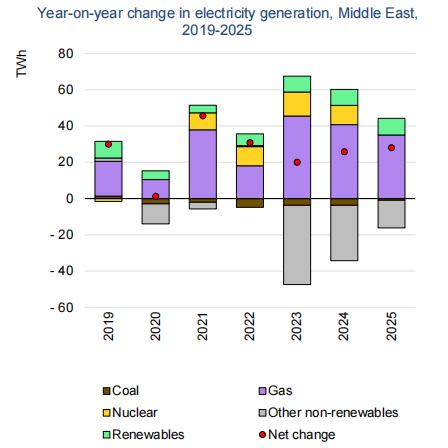 2022年,受人口增長、能源密集型企業(yè)規(guī)模擴大、對空調(diào)和海水淡化需求增加等因素的影響,中東地區(qū)電力需求同比增長超過2.6%。國際能源署預(yù)計,2023—2025年,中東電力需求的年均增速將略低于2022年。天然氣將依然是中東地區(qū)的主要電力來源,其發(fā)電量占比將從2022年72%增加到2025年77%,而燃油發(fā)電量預(yù)計將從2022年21%下降到2025年14%。2022年中東地區(qū)發(fā)電相關(guān)碳排放量略有增長,漲幅為0.7%,預(yù)計到2025年將下降2%。