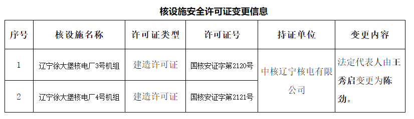根據(jù)《中華人民共和國(guó)核安全法》《核動(dòng)力廠、研究堆、核燃料循環(huán)設(shè)施安全許可程序規(guī)定》的有關(guān)要求,我局對(duì)你公司提交的遼寧徐大堡核電廠3、4號(hào)機(jī)組建造許可證法定代表人信息變更的申請(qǐng)進(jìn)行了審查,認(rèn)為相關(guān)信息的變更符合核設(shè)施安全許可證變更的程序要求,現(xiàn)予確認(rèn)。