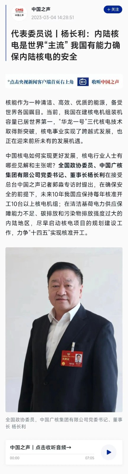 3月4日下午,全國政協十四屆一次會議在北京隆重開幕,第十四屆全國政協委員中國廣核集團有限公司黨委書記、董事長楊長利與2100多名新一屆全國政協委員齊聚首都, 共商國是,積極履職盡責 ,為全面建設社會主義現代化國家貢獻智慧和力量。中央廣播電視總臺中國之聲就我國核電如何實現更好發展專訪楊長利刊播報道。