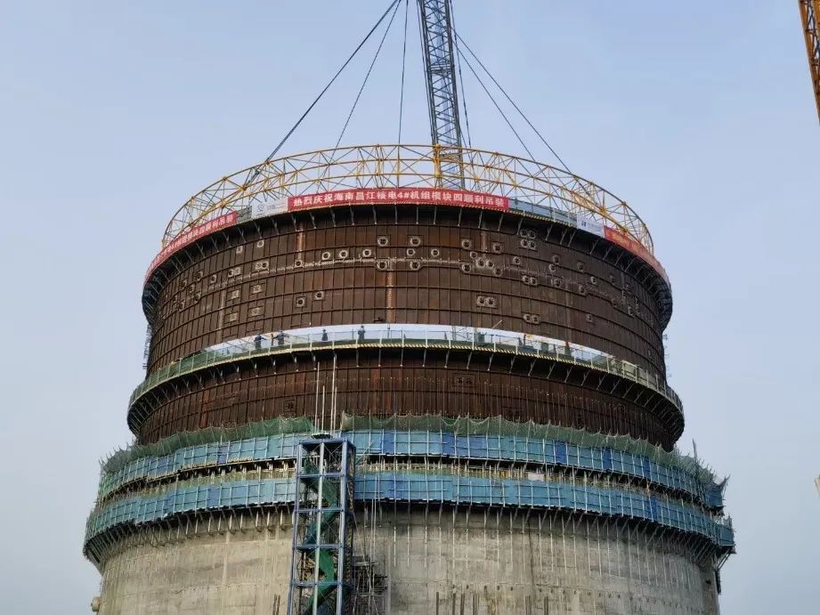 2023年3月17日8時08分,海南昌江核電廠4號機組核島反應堆廠房內殼鋼襯里模塊四吊裝就位,歷時3時10分,整體吊裝過程安全、可控。