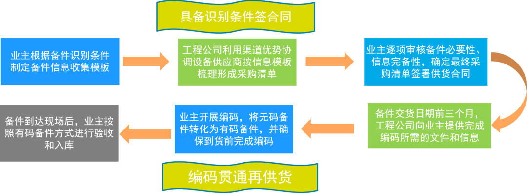 惠州公司合同采購部與維修部組成的項目團隊主動作為,誓要啃下SO備件采購這塊硬骨頭,在經過多方調研、摸清問題、理順業務邏輯后,果斷放棄傳統的CPR機組SO備件供貨模式,即備件到貨后再識別移交的模式,創新采用“信息梳理-確定清單-編碼供貨”的方案,即根據工作實際要求先行完成前端備件信息收集,再確定清單范圍,待滿足編碼入庫要求后進行供貨的“惠州方案”(見下圖)。
