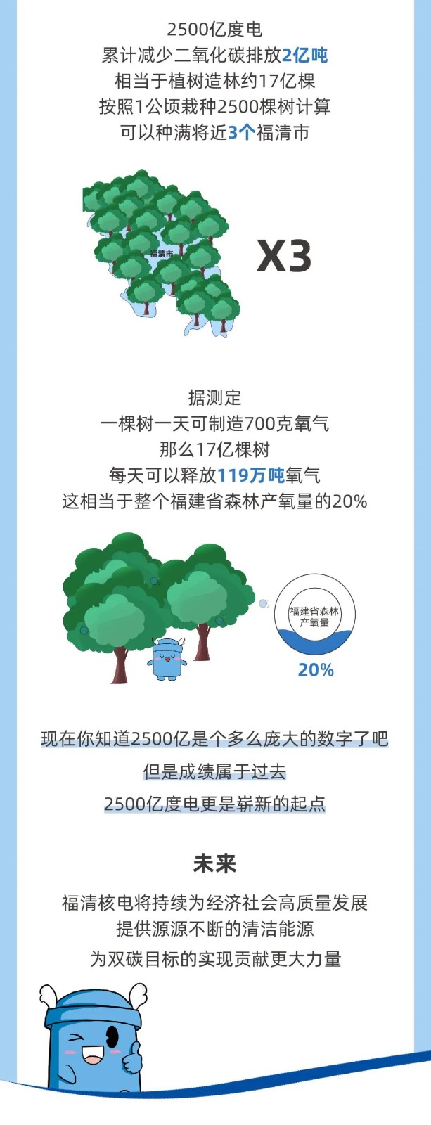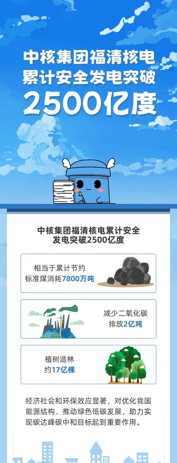 截至目前,中核集團(tuán)福清核電6臺(tái)機(jī)組累計(jì)安全發(fā)電超過2500億度,減排效應(yīng)相當(dāng)于累計(jì)節(jié)約標(biāo)準(zhǔn)煤消耗7800萬(wàn)噸,減少二氧化碳排放2億噸,植樹造林約17億棵。這其中,華龍一號(hào)全球首堆示范工程兩臺(tái)機(jī)組年發(fā)電量200億度,相當(dāng)于每年減少標(biāo)準(zhǔn)煤消耗624萬(wàn)噸、減少二氧化碳排放1632萬(wàn)噸,植樹造林1.4億棵,經(jīng)濟(jì)社會(huì)和環(huán)保效應(yīng)顯著,對(duì)優(yōu)化我國(guó)能源結(jié)構(gòu)、推動(dòng)綠色低碳發(fā)展,助力實(shí)現(xiàn)碳達(dá)峰碳中和目標(biāo)起到重要作用。
