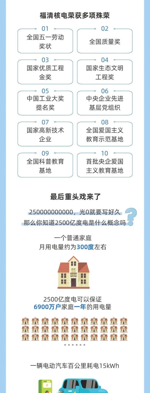 2015年華龍一號(hào)全球首堆示范工程落戶福清開工建設(shè),入選《中華人民共和國(guó)大事記》。2021年華龍一號(hào)全球首堆投入商運(yùn),入編《中國(guó)共產(chǎn)黨一百年大事記》。2022年華龍一號(hào)全球首堆示范工程全面建成,入編《黨的十九大以來大事記》,亮相“奮進(jìn)新時(shí)代”主題展,連續(xù)兩年榮獲央企“十大國(guó)之重器”稱號(hào)。2023年4月27日,福清核電榮獲全國(guó)五一勞動(dòng)獎(jiǎng)狀。