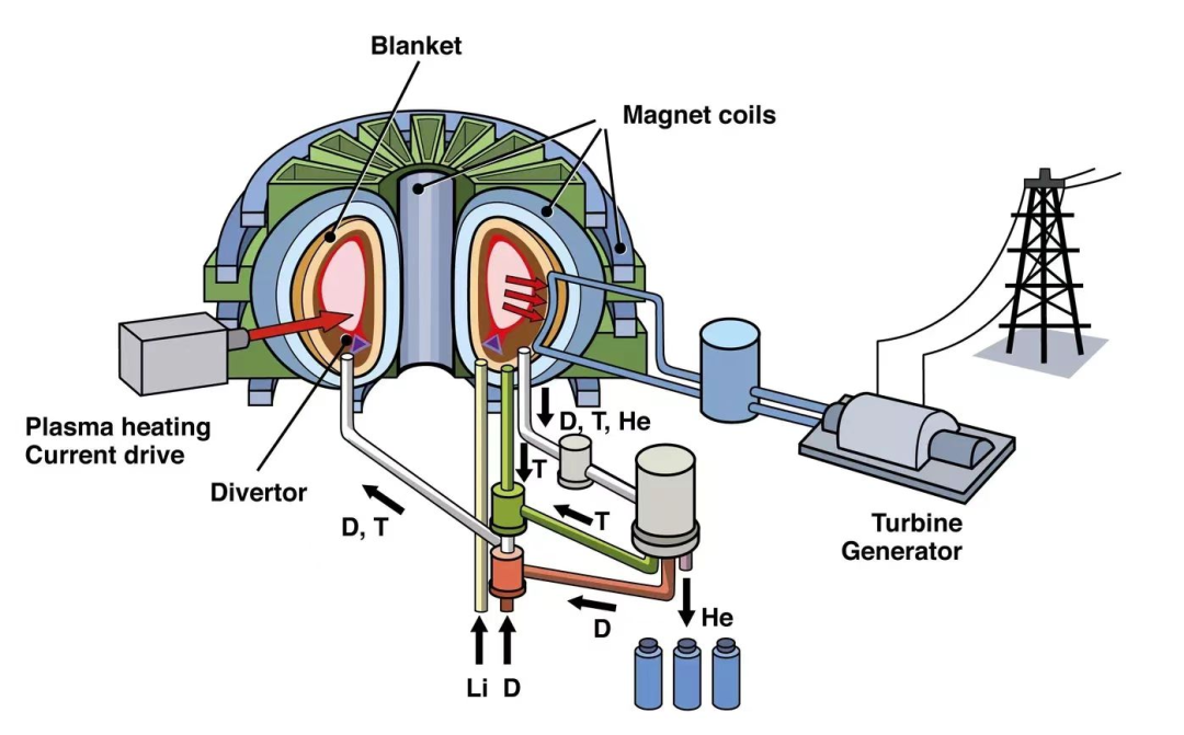目前,可控核聚變的技術路線大體有三種,分別是重力場約束核聚變,激光慣性約束核聚變和磁約束核聚變。現今,磁約束核聚變研究中,托卡馬克是已發展的最有希望利用熱核聚變發電的技術方案,也被譽為“人造太陽”。托卡馬克是一種利用磁約束來實現受控核聚變的環形容器,它的中央是一個環形的真空室,外面纏繞著線圈,在通電時內部會產生巨大的螺旋形磁場,將其中的等離子體加熱到很高的溫度,以達到核聚變的目的。