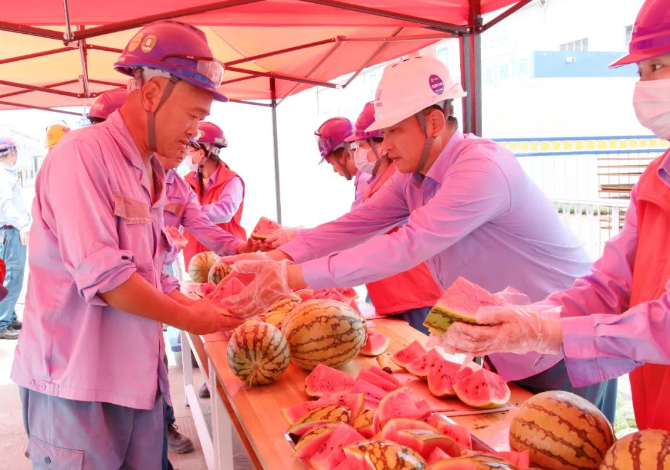 本次澆筑為跨晝夜連續(xù)作業(yè),涉及人員、設(shè)備眾多,作業(yè)人員身心健康也是重點(diǎn)任務(wù)之一。面對(duì)連續(xù)出現(xiàn)的高溫天氣,項(xiàng)目部嚴(yán)格實(shí)行“抓兩頭,歇中間”的避高溫措施,科學(xué)安排項(xiàng)目工程量,優(yōu)化調(diào)整施工工序。深度落實(shí)“夏送清涼”相關(guān)活動(dòng)安排,在澆筑前為工人發(fā)放防暑降溫物資,在核島現(xiàn)場(chǎng)內(nèi)設(shè)置茶水亭、軸流風(fēng)機(jī)風(fēng)扇,不間斷提供淡鹽水、涼茶、藿香正氣水等防暑降溫用品,為一線施工人員做好基礎(chǔ)保障。在文明施工方面,還在核島周邊安裝噴淋系統(tǒng),有效控制現(xiàn)場(chǎng)揚(yáng)塵并為施工作業(yè)起到局部降溫作用。