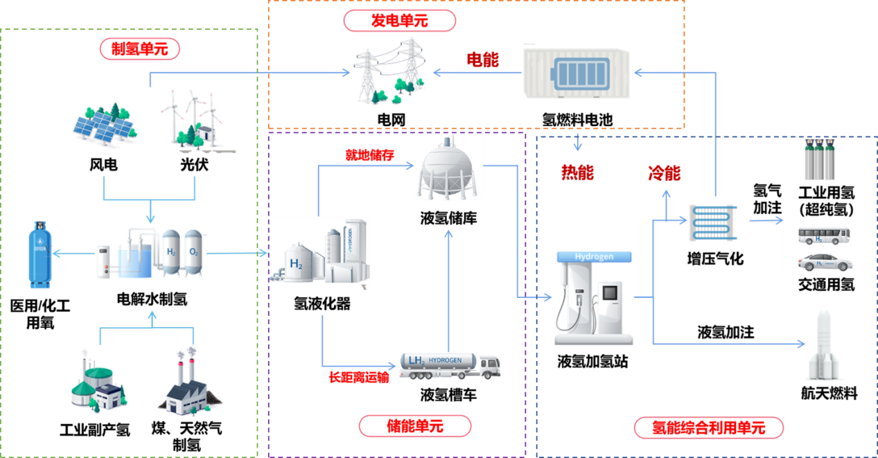 利用液氫的高能量密度、低儲存壓力特性,實現氫能的規模化存儲和基于該形態氫能實現電力儲能、耦合與轉化應用,是提高新能源吸納比例、推動氫能源經濟利用和加快低碳經濟與低碳社會轉型的必經途徑。我單位經過技術攻關,掌握了液氫規模化儲存技術和基于(液)氫能的綜合能源系統設計技術(圖1、2)。具體地,利用電網盈余電力進行電解水制氫,再將氫氣經過壓縮-換熱-膨脹等過程液化成為液氫;利用膜式儲庫的低建設成本實現液氫的大規模和經濟儲存;液氫經增壓、氣化后進入氫發電系統,實現電、熱、冷以及高純氫氣的供應。
