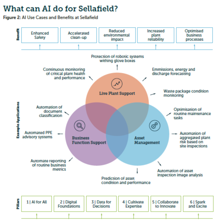 塞拉菲爾德公司的人工智能戰略建立在六大核心支柱基礎上。這些支柱對在資產管理、現場作業支持和職能部門這三個核心領域應用人工智能至關重要。