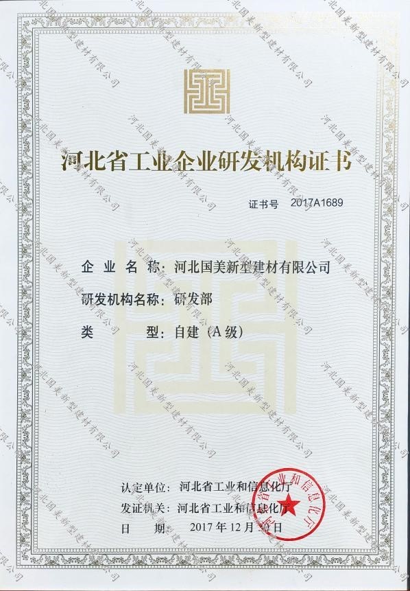 河北國(guó)美新型建材有限公司不斷壯大的同時(shí),在科學(xué)發(fā)展方面取得了豐碩的成果。共開(kāi)展研發(fā)項(xiàng)目28項(xiàng),其中授權(quán)發(fā)明專(zhuān)利2項(xiàng),實(shí)用新型專(zhuān)利18項(xiàng)。被認(rèn)定為“高新技術(shù)企業(yè)”“保溫材料研究院”“河北省企業(yè)技術(shù)中心”“河北省專(zhuān)精特新示范企業(yè)”“河北省專(zhuān)精特新中小企業(yè)”“行業(yè)先進(jìn)單位”。作為“中國(guó)絕熱節(jié)能材料協(xié)會(huì)”常務(wù)理事單位。“中國(guó)鋼結(jié)構(gòu)協(xié)會(huì)、中國(guó)耐火材料協(xié)會(huì)、中國(guó)硅酸鹽協(xié)會(huì)耐火材料分會(huì)、中國(guó)聲學(xué)學(xué)會(huì)”會(huì)員單位,參與了多項(xiàng)國(guó)家標(biāo)準(zhǔn)、團(tuán)體標(biāo)準(zhǔn)的制定、修訂工作。