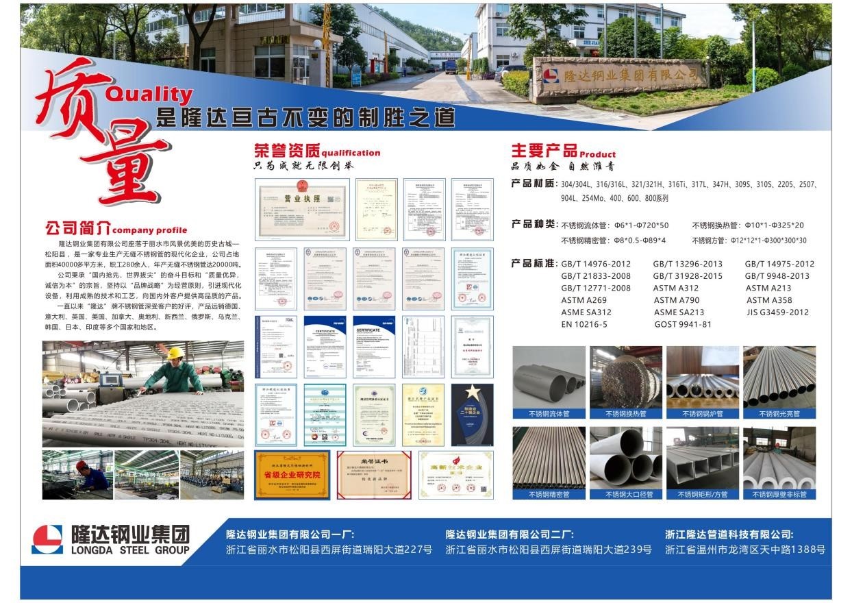 隆達(dá)鋼業(yè)集團(tuán)有限公司座落于麗水市風(fēng)景優(yōu)美的歷史古城—松陽(yáng)縣,是一家專業(yè)生產(chǎn)無(wú)縫不銹鋼管的現(xiàn)代化企業(yè),公司成立于2005年,注冊(cè)資本18500萬(wàn)元,占地面積40000多平方米,年產(chǎn)量18000噸。公司秉承"國(guó)內(nèi)領(lǐng)先,世界一流"的奮斗目標(biāo)和"質(zhì)量第一,誠(chéng)信為本"的宗旨,堅(jiān)持以"品牌戰(zhàn)略"為經(jīng)營(yíng)原則,引進(jìn)先進(jìn)設(shè)備,利用成熟的技術(shù)和工藝,向國(guó)內(nèi)外客戶提供高品質(zhì)的產(chǎn)品。一直以來(lái)“處鋼”牌不銹鋼管深受客戶的好評(píng),產(chǎn)品遠(yuǎn)銷(xiāo)二十多個(gè)國(guó)家和地區(qū)。