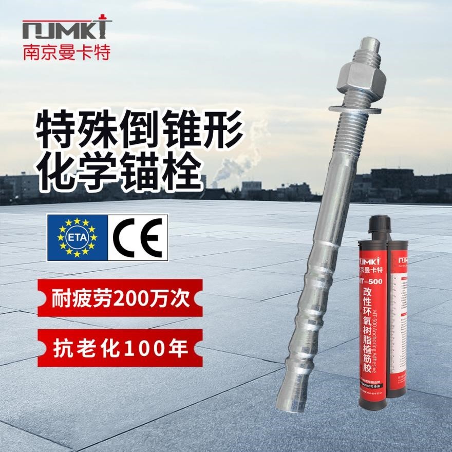 曼卡特特殊倒錐形化學錨栓,是由平墊,螺母,螺桿組成的一種金屬化學錨栓,配合植筋膠使用。基理是依靠膠粘劑的粘接作用,使得外部力經螺桿、膠水傳遞到基材混凝土上,借鑒機械錨栓的鎖鍵效應原理,在受力上,特殊倒錐形化錨錨固的可靠度得到大幅度提升,即便是混凝土破壞時也會控制為錐體受拉破壞狀態。產品通過抗疲勞200萬次試驗,耐火性能120min測試,通過歐盟“ETA”機構組織的性能測試認證。