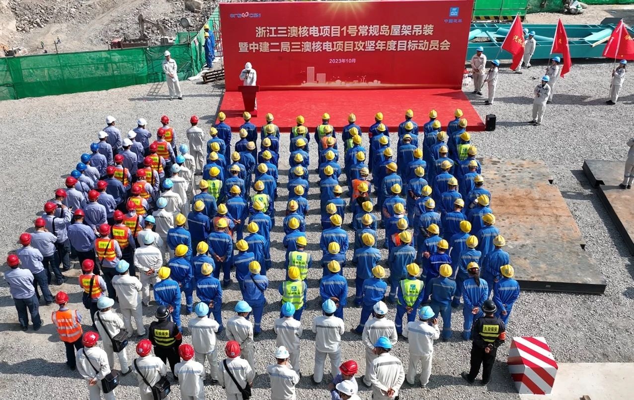 在吊裝現場,中建二局三澳核電項目部召開了1號常規島主廠房鋼屋架吊裝暨2023年年度施工目標攻堅動員會。蒼南核電工程管理部經理黃磊、中廣核工程蒼南項目部副總經理范廣昌、核鵬監理蒼南項目監理部副總監高坤岳出席動員會并發表講話,對大家取得的成績表示熱烈的祝賀,向全心投入工程建設的各方單位表示誠摯的謝意,也向奮戰在一線、付出辛勤勞動的中建二局三澳核電項目團隊廣大員工和工友們表示最由衷的敬意,同時也對常規島施工下一階段重點任務目標作出積極動員。