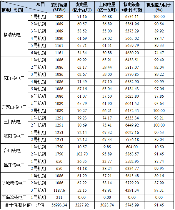 3)本表“合計(jì)值/整體值/平均值”中,裝機(jī)容量、發(fā)電量、上網(wǎng)電量為各機(jī)組合計(jì)值,核電設(shè)備利用小時(shí)數(shù)為全部機(jī)組整體值,機(jī)組能力因子為全部參與統(tǒng)計(jì)的機(jī)組的算數(shù)平均值。
