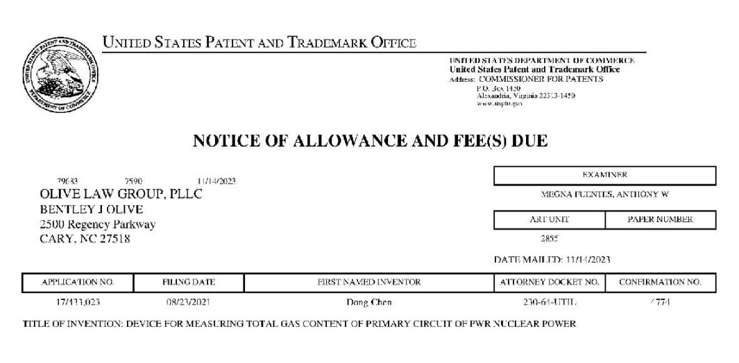 近日,三門核電發(fā)明專利“一種壓水堆核電一回路總含氣量測定裝置” 獲美國專利商標局(USPTO)授權。該專利作為三門核電技術專利走出國門的首次成功嘗試,經(jīng)過技術評估、查新論證、國際檢索,于2021年8月5日完成《專利合作條約》(PCT)受理,2022年5月26日獲準進入美國國家階段申請,順利通過美國專利商標局(USPTO)近一年半的嚴格審查,實現(xiàn)了三門核電國際專利授權“零的突破”。