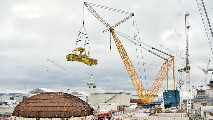 這臺(tái)重 750 噸的極地起重機(jī)已被吊裝到欣克利角 C 核電站的第一座反應(yīng)堆大樓上就位,該核電站由 EDF 在英格蘭西南部建造。