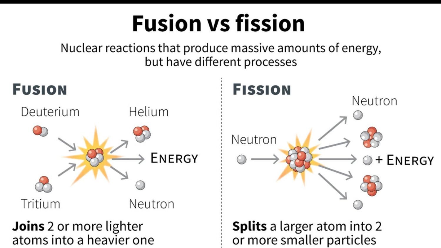 核聚變與裂變的圖形比較,這兩種物理過程產生大量能量,產生的能量是其他能源的數百萬倍