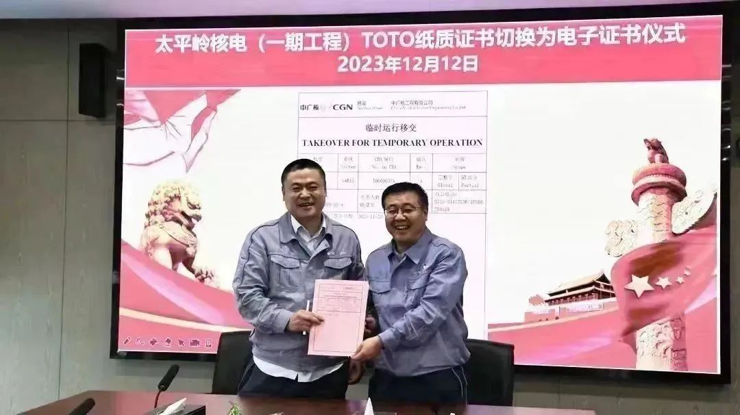 12月12日,股份公司生產準備PG組領導下的群廠共建、惠州核電牽頭開發的TIM證書電子化移交建設項目功能已全部完善,同時最后一份臨時運行移交(TOTO)紙質證書完成流轉簽字,正式切換為電子證書。太平嶺核電3T紙質證書的流轉和簽署正式退出歷史舞臺,移交接產證書由紙質向電子化轉化,體現了移交接產的創新與實踐。該項目的移交接產證書電子化成果將在群廠推廣使用,旨在為集團內外樹立標桿,落實“國際標桿工程”建設目標的有力行動舉措。惠州核電黨委委員、副總經理舒亮參與見證。