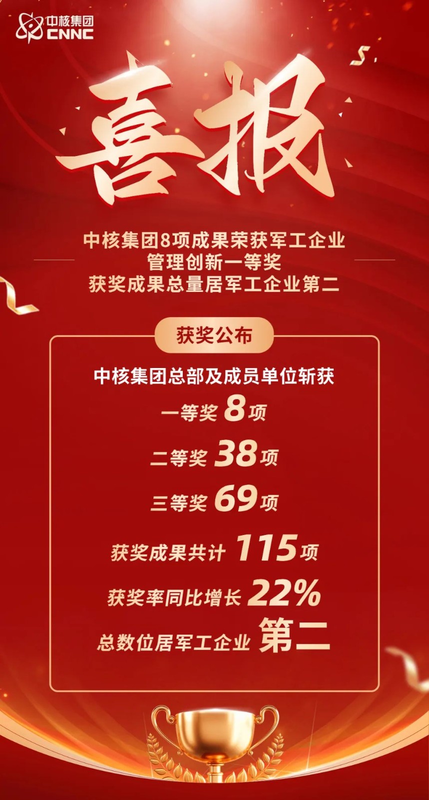 近日,中國(guó)國(guó)防工業(yè)企業(yè)協(xié)會(huì)第十九屆軍工企業(yè)管理創(chuàng)新成果獎(jiǎng)公布,中核集團(tuán)總部及成員單位斬獲一等獎(jiǎng)8項(xiàng),二等獎(jiǎng)38項(xiàng),三等獎(jiǎng)69項(xiàng),獲獎(jiǎng)成果共計(jì)115項(xiàng),獲獎(jiǎng)率同比增長(zhǎng)22%,總數(shù)位居軍工企業(yè)第二。