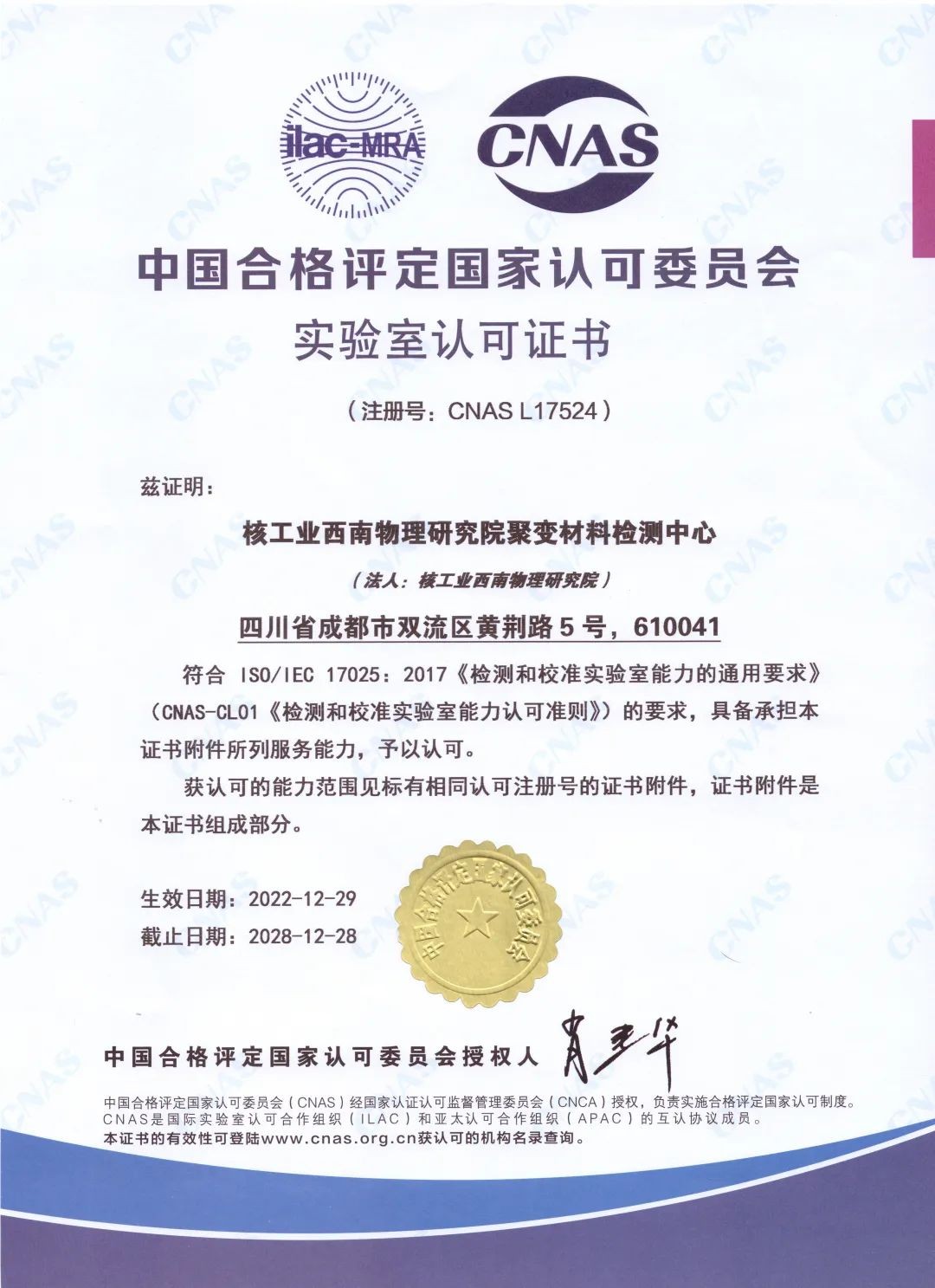 近期,核工業西南物理研究院聚變材料檢測中心(以下簡稱“檢測中心”)順利通過中國合格評定國家認可委員會(CNAS)定期監督現場評審,并于2024年2月27日獲批繼續持有CNAS實驗室認可證書資格。