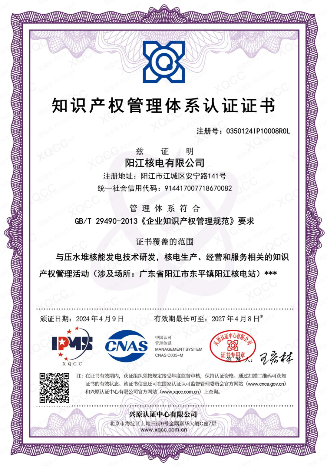 近期,陽江核電成功通過國家知識產權管理體系認證,獲得國家“知識產權管理體系認證證書”,標志著陽江核電在知識產權管理領域邁出了堅實的步伐。