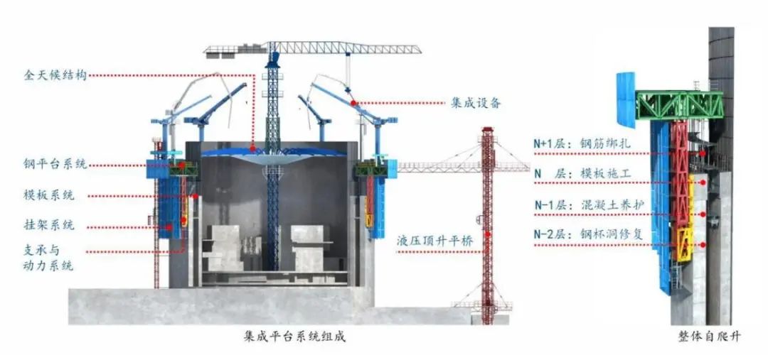 核島施工平臺是基于超高層住宅建筑的“住宅造樓機”和摩天大樓的“空中造樓機”技術而研發的核電反應堆廠房專屬施工技術。該技術通過內外殼等高同步施工立面流水作業設備設施集成等方式提升施工工效縮短施工周期、降低安全風險。同時它還具有整體自爬升、多層作業面服務全階段、設備設施集成、安全監控保障等顯著特征。