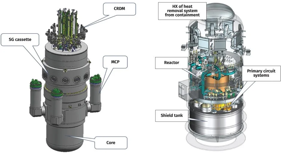 RITM-200N核電站的整體設計設想在單個容器內使用堆芯和蒸汽發生器(SG)。如下圖(右)所示,反應堆冷卻劑泵(RCP)直接焊接在反應堆壓力容器(RPV)上,不包括反應堆冷卻劑系統(RCS)中的任何管道。