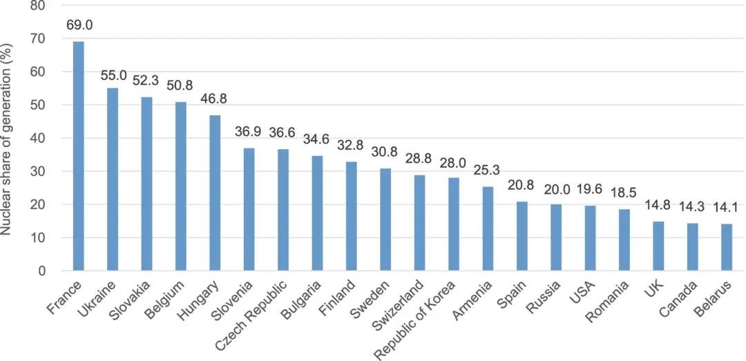 圖1 核電占比超過(guò)本國(guó)電力供給1/5的國(guó)家(2021年12月)。