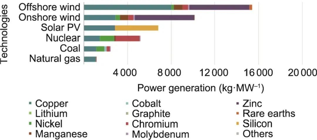 圖6 不同發(fā)電技術(shù)所需的材料量(不包括燃料),以t?(TW·h)-1的形式表示。NGCC:天然氣聯(lián)合循環(huán);DOE:美國(guó)能源部。經(jīng)許可轉(zhuǎn)載自參考文獻(xiàn)。