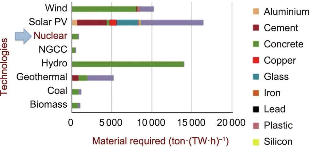 圖5 不同發(fā)電技術(shù)所需的材料量(不包括燃料),以單位裝機(jī)容量(MW)所需的材料質(zhì)量表示。經(jīng)許可轉(zhuǎn)載自參考文獻(xiàn)。