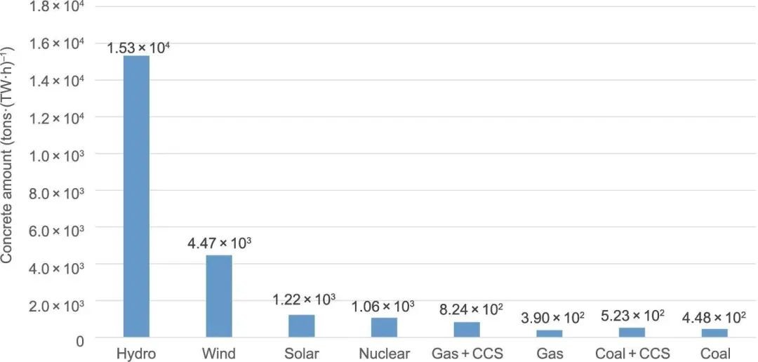 圖7 從全生命周期分析中推斷的各種發(fā)電形式所需混凝土量[t?(TW·h)-1]。經(jīng)許可轉(zhuǎn)載自參考文獻(xiàn)。