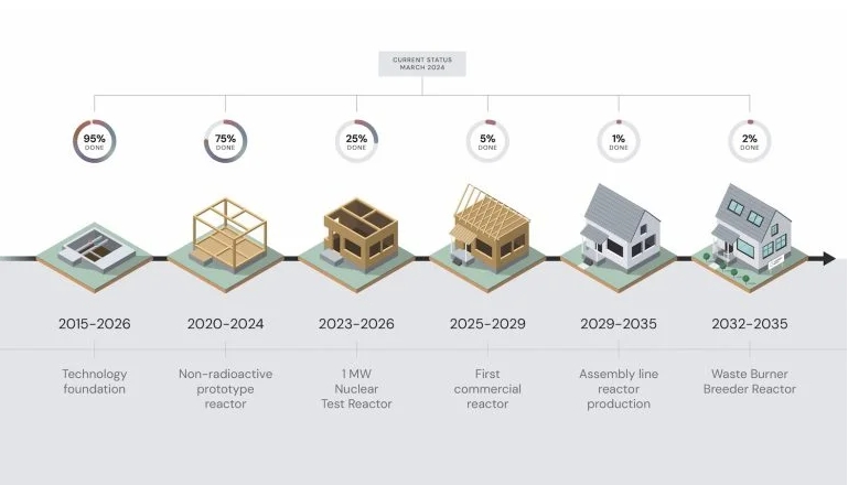 在實現里程碑 #3 之后,里程碑 #4預計會相對簡單,盡管在建造五到十個商用反應堆之前可能需要運行多個版本的測試反應堆。目標是到 2028 年擁有商用反應堆,但要等待愿意支持此類先進反應堆的國家的批準。計劃在目前的公司總部組裝十個商用反應堆。