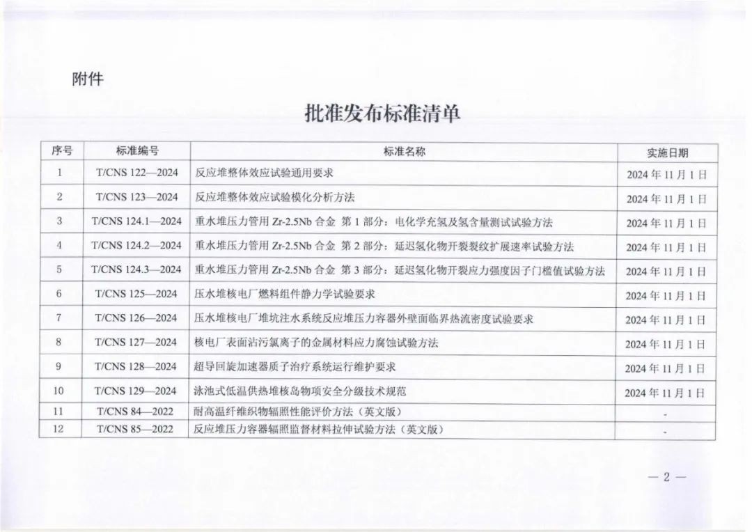 中國核學會批準《反應堆整體效應試驗通用要求》(T/CNS122-2024)等10項團體標準和《耐高溫纖維織物輻照性能評價方法》(T/CNS842022)等2項團體標準英文版,現予以公布: